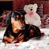 We have a midi black & tan Dachshund named Dax. He has a white image of a Dachshund on his chest, which makes him stand out in the crowd of those Dachshund dog walks we often take.